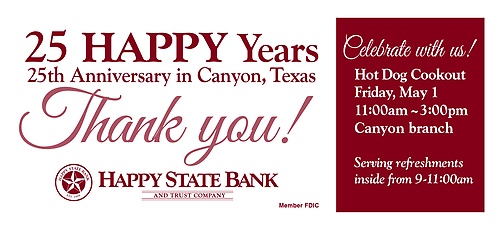 Come out Friday, May 1st and Celebrate 25 Years with Happy State Bank!
