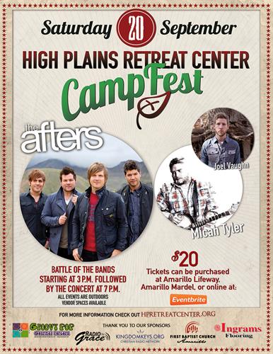 CampFest will be held at High Plains Retreat Center 10 minutes northwest of Canyon. The day will begin with a Battle of the Bands at 3:00pm & the concert at 7:00pm.